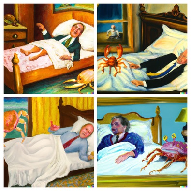 Accompanying AI pics with the command: “An oil painting of an Illinois state Representative being visited in the middle of the night by the ghost of a tie-dyed hermit crab”…