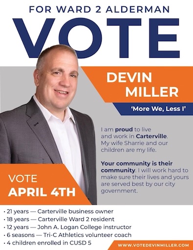 I am related to Devin Miller and this is definitely an endorsement. He will make an outstanding Alterman for Carterville. If you live in his Ward, please vote for him.