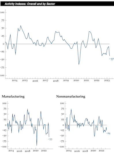 The decline in activity is particularly pronounced in the manufacturing sector, whose April rating of -55 was easily the lowest in three years.