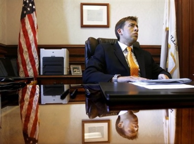 State Treasurer Alexi Giannoulis watches the NBA playoffs while working late in his Springfield office. Contrary to earlier reports, the 50″ plasma television on the wall of his office was not a gift from Tony Rezko.