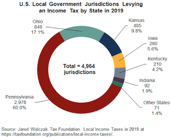 According to the Tax Foundation, approximately 4,964 local government jurisdictions in 17 states imposed local option income taxes in 2019. They are primarily municipalities and counties. Nearly 60% of the jurisdictions are in Pennsylvania.