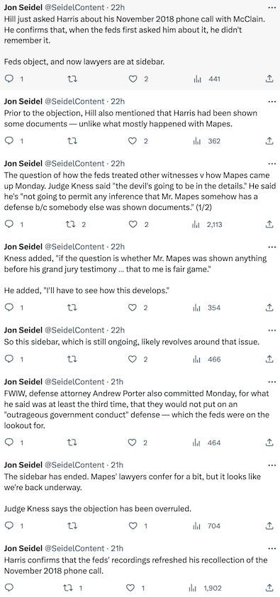 The idea that Mapes was not given the opportunity to review any of the wiretapped calls or any other evidence – save for one document – during an early 2021 meeting with the FBI or his grand jury testimony is one the defense sprinkled throughout opening statements and while cross-examining the two witnesses put on the stand on Wednesday. Hill likened it to not being able to recall details from high school a decade after graduation unless prompted with items like a yearbook or notes passed in class.