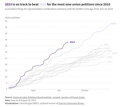 “When you see [petitions] increasing, you are seeing what we would call a leading indicator that there is an increased level of support for unionization,” [Robert Bruno, professor of Labor and Employment Relations in the School of Labor Employment Relations at the University of Illinois Urbana-Champaign] said. “It also strongly suggests that there’s a lot of current organizing going on.”