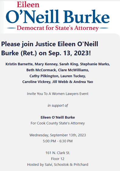 On September 13, Eileen O’Neill Burke is set to hold a “Women Lawyers” fundraiser at the law offices of Salvi, Schostok & Pritchard.