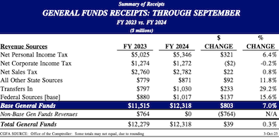 Despite the September decline, Federal Sources (base) are up $137 million year to date. However, if the $764 million in one-time ARPA Reimbursements receipted in FY 2023 are included in the equation, Federal Sources are down $627 million through the 1st Quarter of the fiscal year.