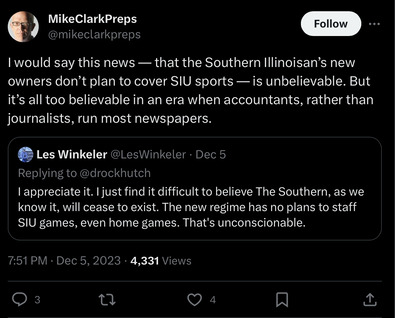 No coverage of SIU sports, local school sports, city council meetings, SIU Board of Trustees meetings, no coverage of what local and regional politicians are up to, no one to tell the story of the people of Southern Illinois.