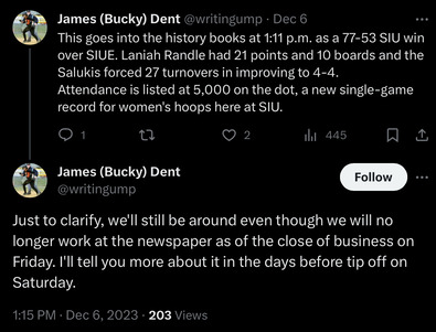 * I spent about three years sitting on the sidelines of SIUC games with Southern photogs while I was at the Daily Egyptian. It’s a bleak thought that their coverage will no longer continue…