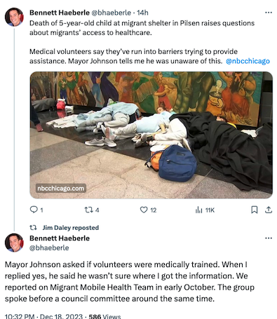 * NBC Chicago | Johnson pushes back on questions over medical care for migrants after child’s death: A cause of death has not yet been determined in the child’s death, but Chicago Department of Public Health officials say that there have been cases of several illnesses, including chickenpox, at multiple shelters, including the location in the 2200 block of South Halsted.