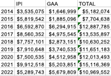 And while the combined revenues for both the IPI and its c4 GAA were similar to those in 2018, there’s been quite a bit of inflation since then. So, the $10.63 million the two organizations raised during 2018 would have been $12.56 million by the end of 2022. That’s $1.59 million more than the groups actually raised in 2022.