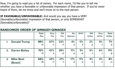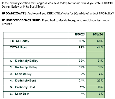 Also, doesn’t Bailey’s poll ultimately prove he’s losing support while Mike Boast is gaining support? And for what it’s worth, I’d assume Bailey has a higher name ID than Bost here in the district.