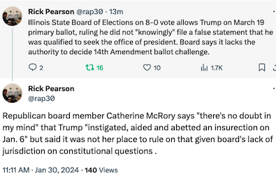 They are going to be looking for a way out. I know what Judge Luttig says and he’s probably right, but I think they should say that because he has not been adjudicated by a court to have participated in an insurrection they can’t kick him off the ballot. I want to see Trump spanked but the only way to do it properly and have any legitimacy is to do so at the ballot box. And even then, Trump doesn’t accept defeat so he’ll do what he did last time and lie. Still, let’s do this the right way.