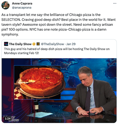 I agree with the Pizza tweet. Give me deep dish once a year, tavern style 10-15 times, and New York/Detroit/Quad Cities style the rest. Chicago is probably the best place to get good versions of all of those.
