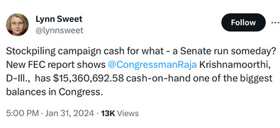 Anyone that doubts that Raja is running for Senate the moment Durbin announces his retirement (or until Duckworth gets tapped as a running mate or for a higher-up cabinet position) can’t see the trees through the forest. He has absolutely built a statewide war chest for that singular purpose.