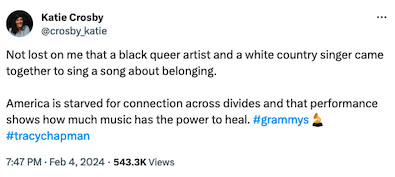 Also, Tracy Chapman and Luke Combs performing “Fast Cars?” Terrific.