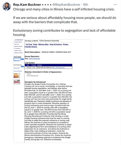 Rep. Buckner’s bill is a reasonable and sensible bill that addresses a direct cause of high housing costs and systemic segregation. Read Color of the Law, by Richard Rothstein, to educate oneself on the issue if need be.