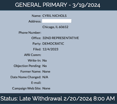 * Rich told subscribers about Rep. Cyril Nichols’ withdrawal Friday evening. From the Illinois State Board of Elections’ website…