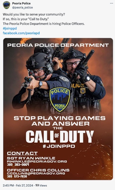 Pretty shameful on the Peoria PD to have an ad like that. I play videogames extensively, but they’re games and should not be used as any kind of glorification or analogy to actual police or military work.