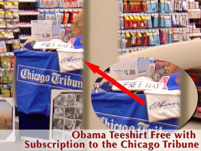 Wow. Some person, probably an independent vendor who gets some kind of commission, has the difficult task of trying to sell Trib subscriptions in the present environment of declining interest in newspapers, and decides s/he may have better luck if s/he offers a t-shirt with Obama’s name on it because he’s a popular guy and people don’t have much interest in t-shirts with Trib on it. Suddenly, it’s a grand conspiracy by the Trib to promote Obama’s candidacy. What a joke. And, are you so sure that the picture is even genuine? Not to question the integrity of an august publication like the National Review, certainly.