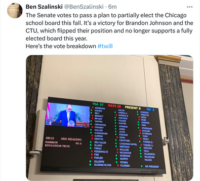 * The Senate voted 37-20 to pass SB15, which would elect the Chicago school board…