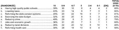 * One of the first questions asked by the pollster was: “Now, I am going to read you a list of priorities for Illinois. Please tell me how important each one is to you, personally, on a scale of zero to ten where a zero means not a priority at all and ten means it is your top priority. You can choose any number from zero to ten. The first one is:”