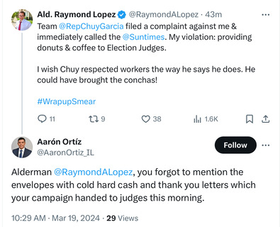 The Congressman’s campaign told the Sun-Times that Lopez’s team members were spotted giving away doughnuts and “envelopes of cash” to election judges in the alderman’s own ward”