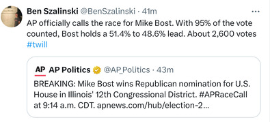 I wouldn’t be shocked if Bailey makes another run at Bost, but then again he might turn towards the Senate race, because I am sure he would do better there.