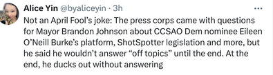 To the “unfair pot shot,” unfortunately, it comes with the territory. You are the Mayor of the third largest city in the country. You just tried to push through a $100 million a year tax hike with no plan for oversight on the spending of the money, or how it was actually going to be allocated to combat homelessness (I won’t comment on the other monies available that either haven’t been used or can’t be accounted for). You openly refuse to answer questions from the media when they either aren’t the softball type. When he was asked to offer transparency on how $300 million worth of migrant support funding has been allocated, he did the same dodge and weave (https://www.nbcchicago.com/investigations/chicagos-migrant-website-obscures-details-on-where-300-million-was-spent/3392762/). I’m sorry, but when it comes to transparency, accountability and offering details to the people he works for - taxpayers - MBJ continues to miss the mark. Even when he says “Thank you for that question. Again, we are meeting you right where you are.”