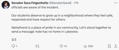 “It’s alarming to see the exponential growth of antisemitic incidents in our state and nationwide. Every segment of the Jewish community has been affected,” said David Goldenberg, Regional Director of ADL Midwest. “Concern in the Jewish community is significant and heightened, especially considering most antisemitic incidents tracked in 2023 occurred after October 7, the deadliest day for Jews since the Holocaust – and it isn’t letting up.”