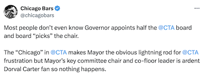 Theoretically Carter’s connections at the Federal Transit Administration (a former employer of his) should make him a real asset to the CTA, but his increasingly out-of-touch perception of how things are at street level is making him more of a liability than an asset. Have heard some internal communications from him and there seems to be a distinct lack of awareness on how things are outside of his office.