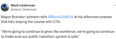 Just to be clear, Pritzker is still responsible for half of the CTA Board. He is arguably equally responsible with Johnson. Glad he is saying something, and better late than never. But this was always his problem too, even if he didn’t cause it.
