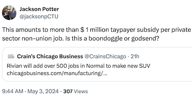 That works out to $4,594 per job, per year over the 30-year lifespan of the deal. [It’s actually probably much less than that because the company currently employs 8,000 workers in Normal] The deal requires Rivian to pay minimum wages of $51,000.