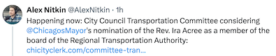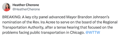 * Background is here on politically connected Black church leaders being appointed to the CTA board who have little to no transit experience. And click here for some mass transit fiscal cliff background. Click here for live video…