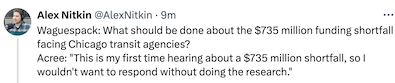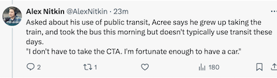 So Rev. Acree makes public transit all about him. “As a man, I don’t have to use CTA.” What.