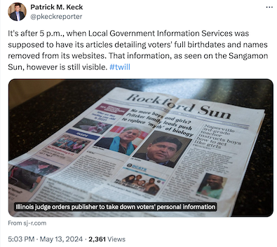 >>> Removing the the street number and the birth date but leaving year is not enough of a fix. How’d they get the information in the first place? Why should they get to keep printing registered voter information at all? The data should be purged.