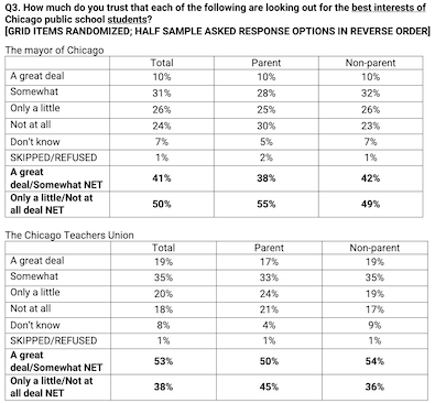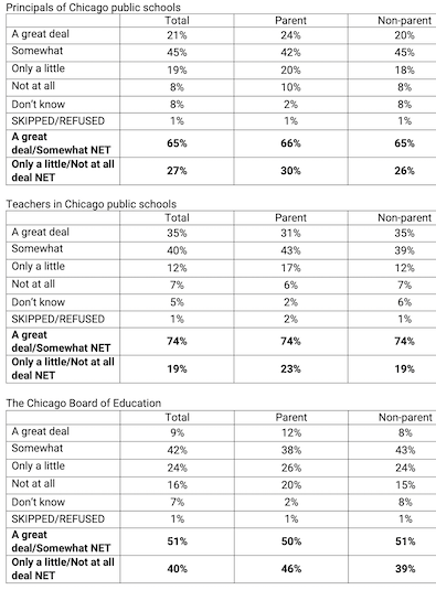 Schleifer notes that parents and others don’t blame teachers but rather see the lack of learning as an effect of poverty and other challenges affecting students. Some 71% of Chicago Public Schools students come from low-income families. Still, poll respondents say leaders are more caught up in petty political battles than on what is best for children. They are not confident money is being spent effectively.