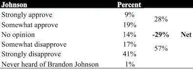Only a combined 28% of likely voters polled said they approve of Johnson’s performance in office, while a majority (57%) disapprove and 41% strongly disapprove.