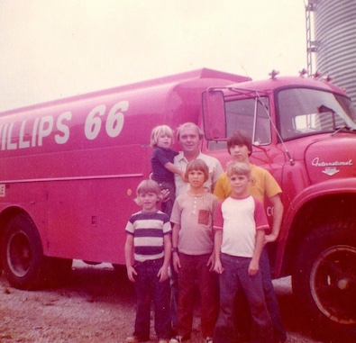 * This is how I’ll always remember my four brothers. My dad had a side gig delivering Phillips 66 gas to farmers and we posed in front of his truck. The photo was taken in, I think, 1975, when we were preparing to leave Iroquois County because my mom had been hired by the Department of Defense and was being trained at the Savanna Army Depot in northwest Illinois. We eventually ended up living in Utah and Germany. Isabel’s dad, Devin, was a baby then. My dad, Isabel’s grandfather, is holding him in the pic. I’m standing next to Dad wearing my Shaw-Waw-Nas-See 4-H Camp t-shirt…
