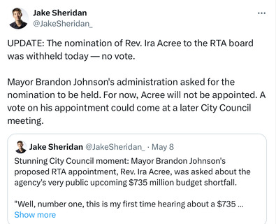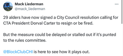 The resolution, introduced by Alds. Andre Vasquez, 40th, and Matt Martin, 47th, with 27 co-sponsors, calls for Mayor Brandon Johnson to replace CTA President Dorval Carter, joining the growing chorus calling for the transit chief’s ouster. But Ald. Jason Ervin, 28th, put a temporary block on the measure by banishing it to the Rules Committee, which will test the resolve of the sponsors to continue to push the issue. […]