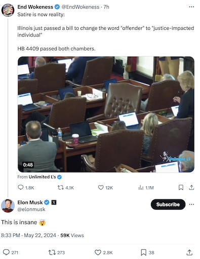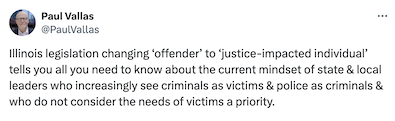 * CWB ran the Center Square story with the headline: “Apologizing for the criminal? Illinois set to change ‘offender’ to ‘justice-impacted individual’ in state laws.”