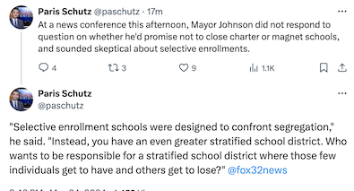 …Adding… Somebody just pointed out the fine print on Mayor Johnson’s tweet: “Note: Selective high school data includes Jones, Lane Tech, Whitney Young, Payton and North Side.” The city has eleven selective enrollment schools, and the ones not mentioned above have significantly higher Black and Brown enrollment.