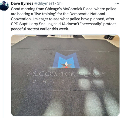 * Tribune | City poised to offer DNC protesters route near United Center: Mayor Brandon Johnson’s administration is poised to offer protesters at the Democratic National Convention a route near the United Center to potentially settle a federal lawsuit claiming the city of Chicago is violating protesters’ First Amendment rights by blocking plans to march within “sight and sound” of the convention hall. The development was revealed at a hearing Thursday in the lawsuit filed by the U.S. Palestinian Community Network, which is seeking an injunction blocking the city from confining protesters to places far from the convention site, such as Grant Park.