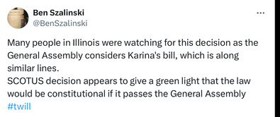 The ruling was narrow but I think it’s interesting that the Court said that the Bruen ruling doesn’t mean that the Government can’t regulate guns at all based on the goofy test Justice Thomas set up in that ruling. But each and every restriction will now have to go to the Court to get a determination. But it’s nice to see that regulation is possible even after the ruling and that some of the “no regulations ever” people citing the Bruen case have been put in their place a little bit.