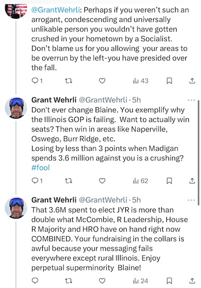 * The column sparked a harsh back and forth between former Republican Rep. Grant Wehrli of Naperville and current Rep. Blaine Wilhour of Beecher City…