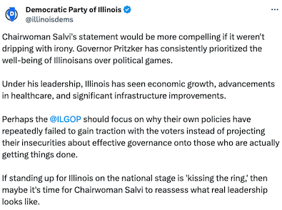 Miss Salvi seems unhinged as Illinois Republican Party chair.She swings for the fences but is called out at first base. Miss Salvi needs better material if she chooses to remain the spokesperson for the Illinois GOP.