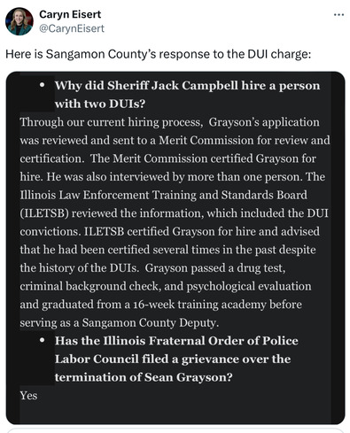 The Illinois Fraternal Order of Police files a grievance with the Sangamon Co. Sheriff, arguing Dep. Sean Grayson should not have been fired after he shot Sonya Massey in the face and is now facing first degree murder charges. pic.twitter.com/1s02K7XZyX