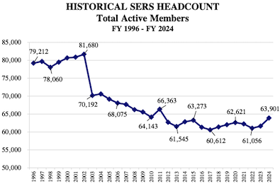 The big drop from 2002 to 2003 was the result of the Early Retirement Incentive program when about 11,000 State employees retired. A lot of institutional knowledge was lost then.