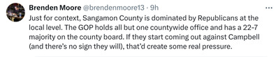 “As a vital first step towards reforming the tragically broken culture within the Sangamon County Sheriff’s Department, the Sangamon County Democratic Party calls on Sheriff Jack Campbell and his senior leadership team to resign effective immediately. For decades the unspoken practice of “legacy hires” and “go along to get along” have permeated throughout the County Building. Jack Campbell’s resignation would only be a bandaid on the deep cut the Sheriff’s Department has inflicted upon our community. Only with entirely new leadership can the Sangamon County Sheriff’s Department begin the essential work of restoring the public’s trust and serving all members of our community.”