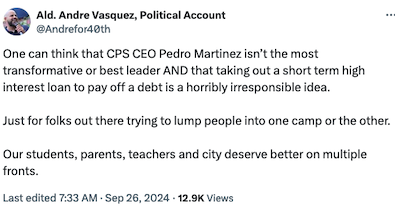 I respect Ald. Vasquez and think he is a good person and well intentioned. However, if MBJ and Stacy fire Pedro, they will saddle CPS with unsustainable debt and who knows what else. It kind of is that simple really.