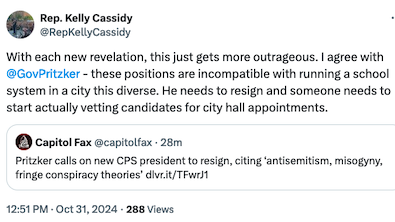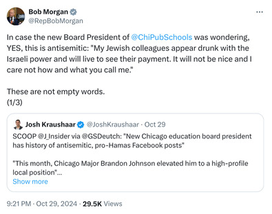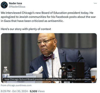 CST/WBEZ is only media outlet calling his posts “criticized as antisemitic.” Even Block Club (via Chalkbeat) is labeling them as antisemitic.
