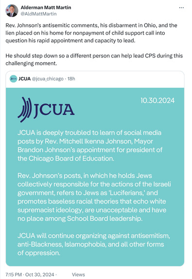 “Today, I asked Chicago School Board of Education (BOE) President Reverend Mitchell Johnson for his resignation, and he resigned, effective immediately. Reverend Mitchell Johnson’s statements were not only hurtful but deeply disturbing. I want to be clear: antisemitic, misogynistic, and conspiratorial statements are unacceptable.